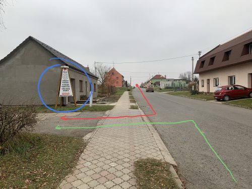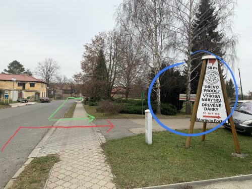 Pro lepší ohraničení jsme zelenou a červenou barvou vyobrazili, jak se k nám dostat z různých směrů. Červenou jsme vyznačili příjezd od Doloplaz/Nezamyslic. Zelenou příjezd od Němčic nad Hanou. Vhodný středobod, dle kterého se můžete orientovat, je modrá tečka, která značí ceduli “prodej dřeva”. Schématickou mapu najdete níže